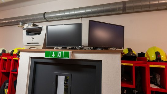 In der Umkleide stehen 67 Spinde für unsere Kameraden zur Aufbewahrung der Einsatzbekleidung bereit. Gleich beim Eingang befindet sich die „Ausgerückt“ Taste, welche der alarmierenden Stelle bekannt gibt, dass der Einsatz übernommen wurde. Zusätzliche sind noch zwei Bildschirme für die Einsatzmeldung angebracht.