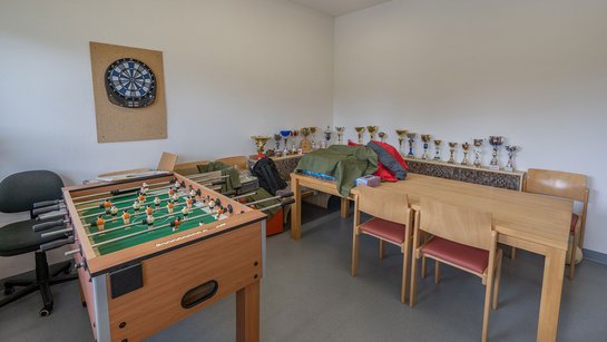 Der Jugendraum dient zur Kameradschaftspflege und Ausbildung unserer Jugendgruppe. Ausgestattet ist dieser Raum mit Sitzmöglichkeiten, einem Fußballtisch, einer Dartscheibe und verschiedenen Regalen und Vitrinen für die erreichten Pokale der letzten Jahre.